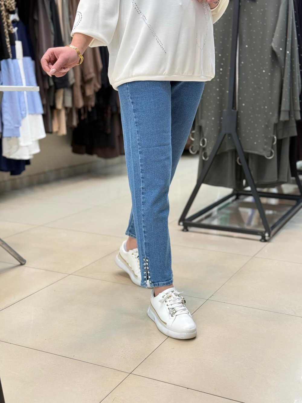 Paçası Taşlı Pantolon Mavi